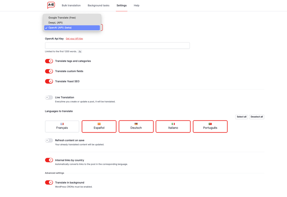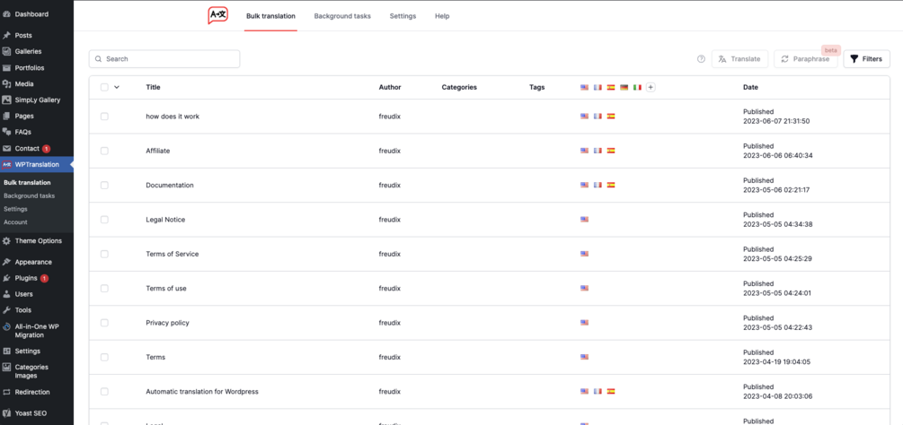 WPtranslation propose également un mode Bulk, permettant de traduire plusieurs pages ou articles en une seule fois. Imaginez le temps économisé en traduisant l’intégralité de votre site en un seul clic avec WPtranslation !
